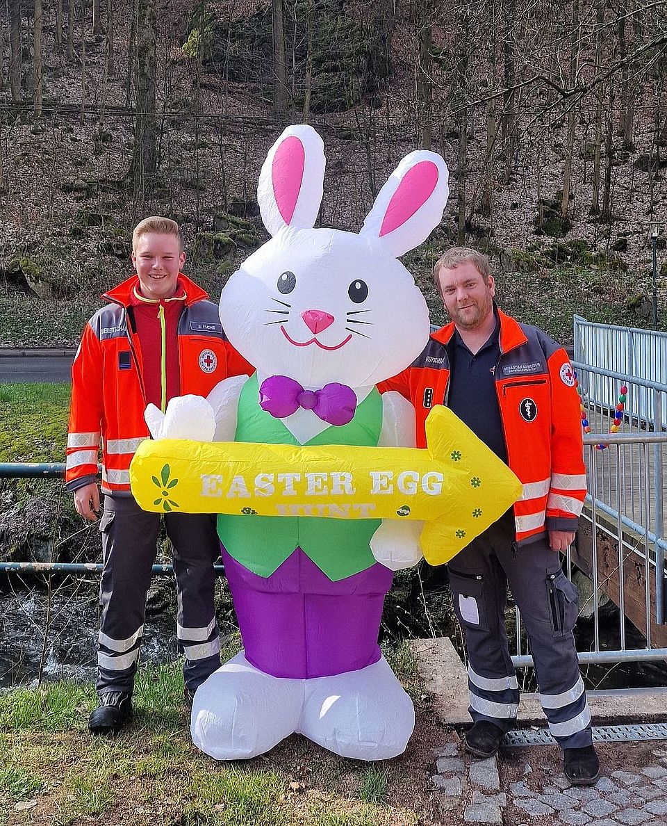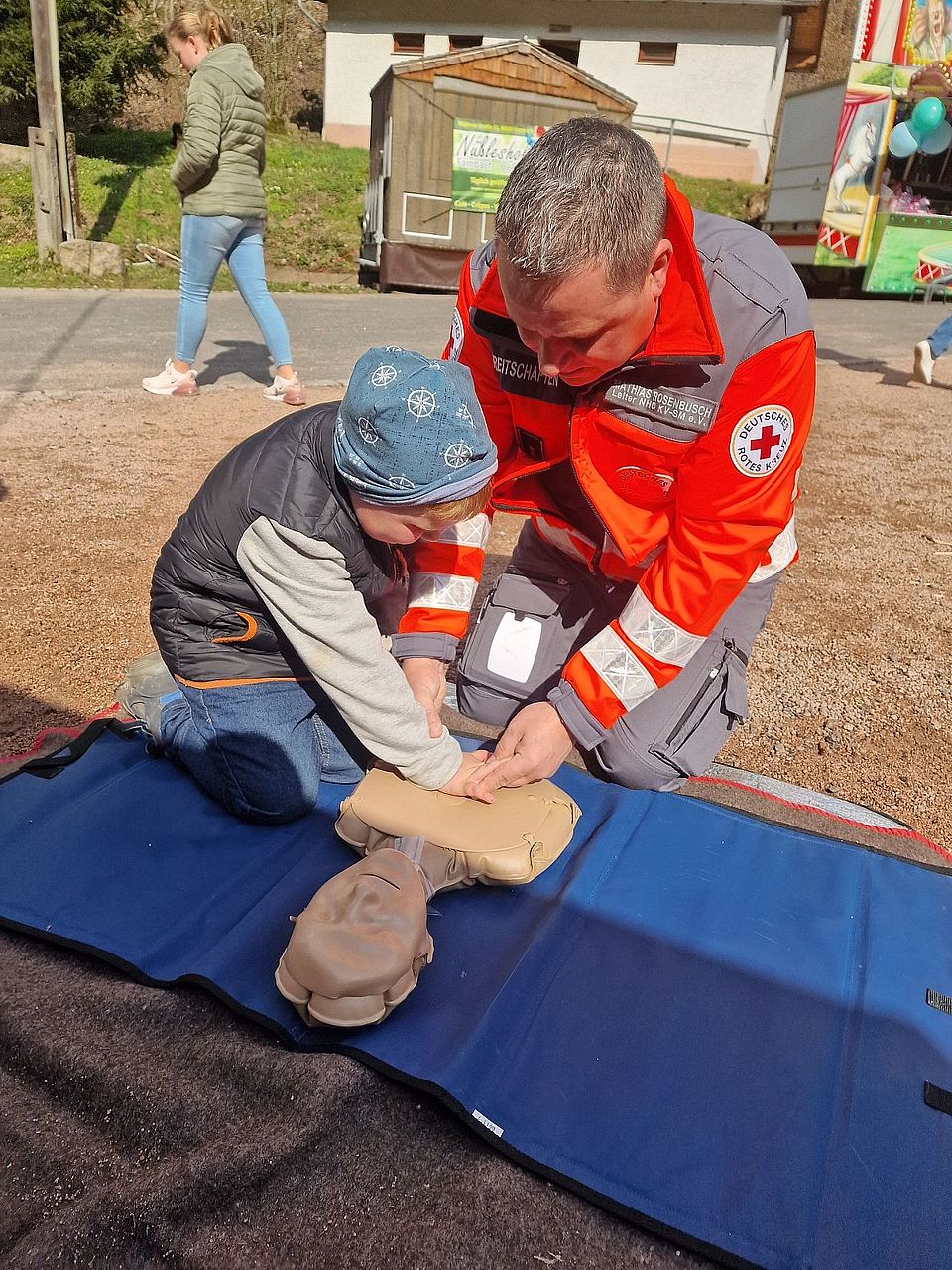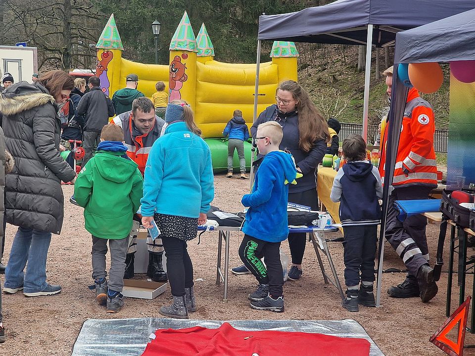 Am Ostersonntag fand am Trusetaler Wasserfall zum zweiten Mal eine große Ostereiersuche statt. 2000 gelbe Eier wurden auf dem Gelände versteckt. Viele Gäste aus Nah und Fern kamen in der Zeit von 11 bis 17 Uhr zum Ausflugsziel und ließen sich dort überraschen- Neben Streichelgehege, Fühlboxen, Kerzen ziehen und Eierlauf war auch der DRK-Ortsverband Brotterode-Trusetal mit einem Stand und vielen großen und kleinen Helfern vertreten. Vier Phantome waren auf Decken und Liege ausgelegt, welche von den Kindern unter fachlicher Anleitung behandelt werden konnten. Pflaster und Verbände durften angelegt werden, an anderer Stelle wurde reanimiert. Werbung für das Projekt "Herzensretter", welches von den helfenden Verbänden ins Leben gerufen wurde. So soll auf die Bedeutung der Ersten Hilfe und besonders der Wiederbelebung aufmerksam gemacht werden und das Thema Wiederbelebung in den Schulunterricht intergriert werden. Über 50 Kinder, ausgestattet mit Arztkittel und Handschuhen, besuchten den Stand und legten auch Hand an. Natürlich nicht umsonst. Zur Belohnung gab es für alle Teilnehmenden eine Urkunde, einen Anstecker und natürlich etwas zu Naschen. Auch mit den älteren Gästen kamen wir oft ins Gespräch und bekamen großen Zuspruch.