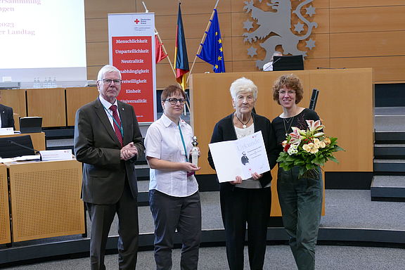 Ein Höhepunkt der diesjährigen Landesversammlung stand gleich zu Beginn der Veranstaltung auf der Tagesordnung: Die Verleihung des DRK-Ehrenamtspreises an Hella Heimer vom DRK-Kreisverband Altenburg. Frau Heimer ist seit 1962 aktives Mitglied des DRK-Altenburg und wurde für ihr Engagement in der Rotkreuzgemeinschaft Lohma ausgezeichnet. Sie engagiert sich unermüdlich in der ehrenamtlichen Wohlfahrts- und Sozialarbeit und baute einen ehrenamtlichen Besuchs- und Betreuungsdienst in der Gemeinde auf, mit der der gesellschaftlichen Isolation insbesondere alter und kranker Menschen aktiv entgegen gewirkt wird. Des Weiteren organisiert sie in ihrer Region seit vielen Jahren Blutspenden.