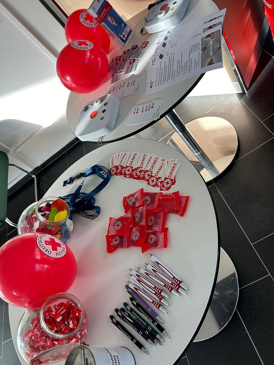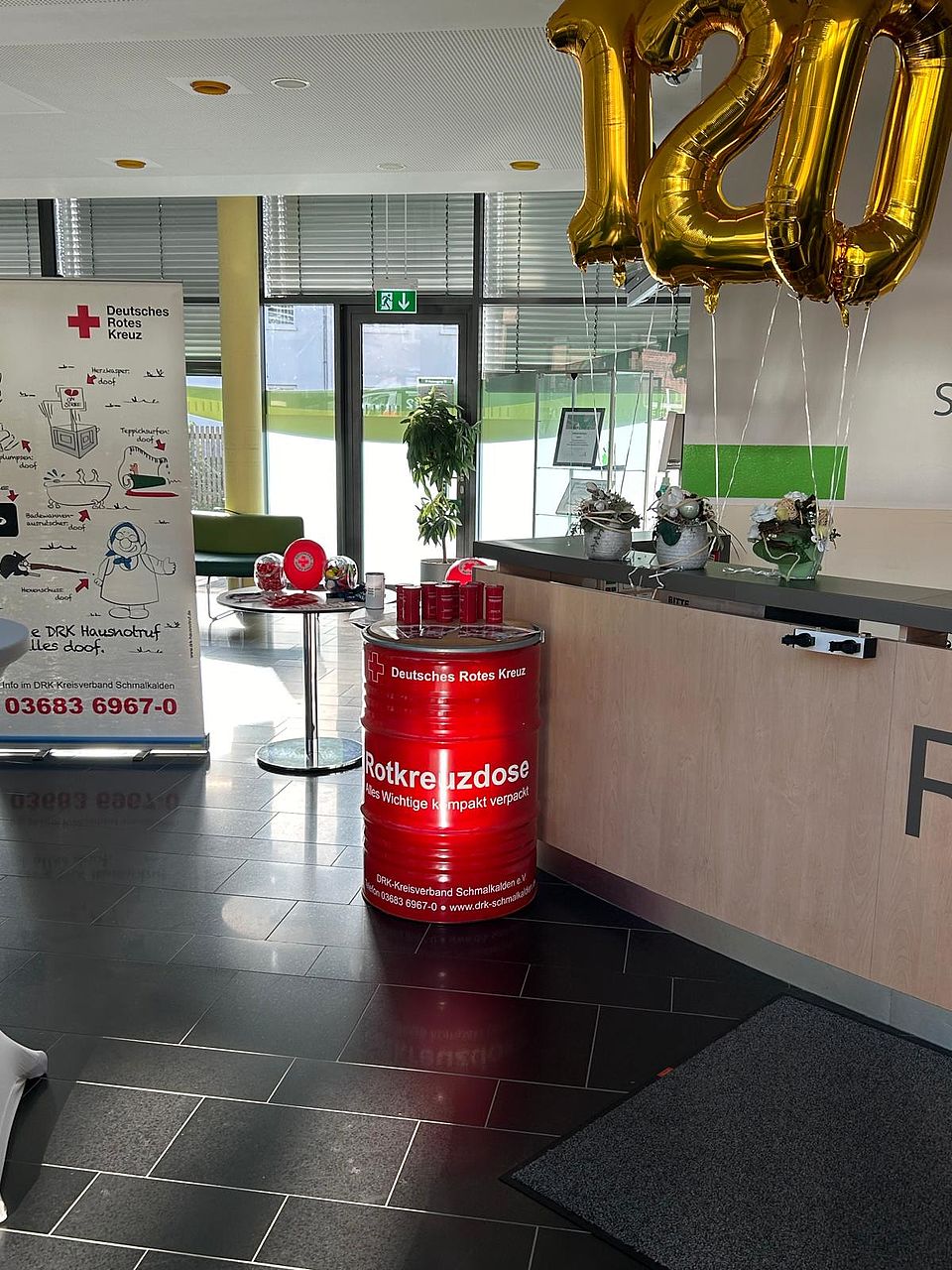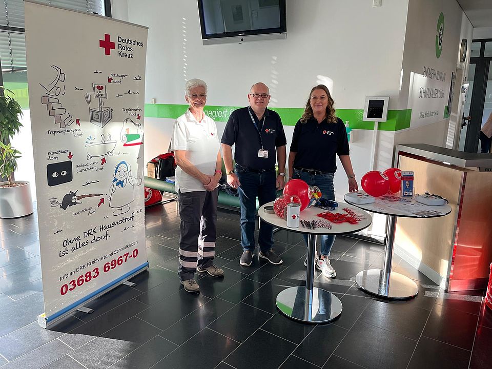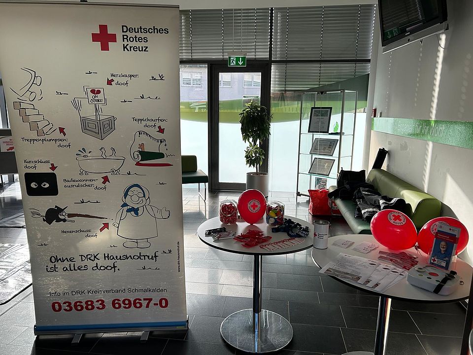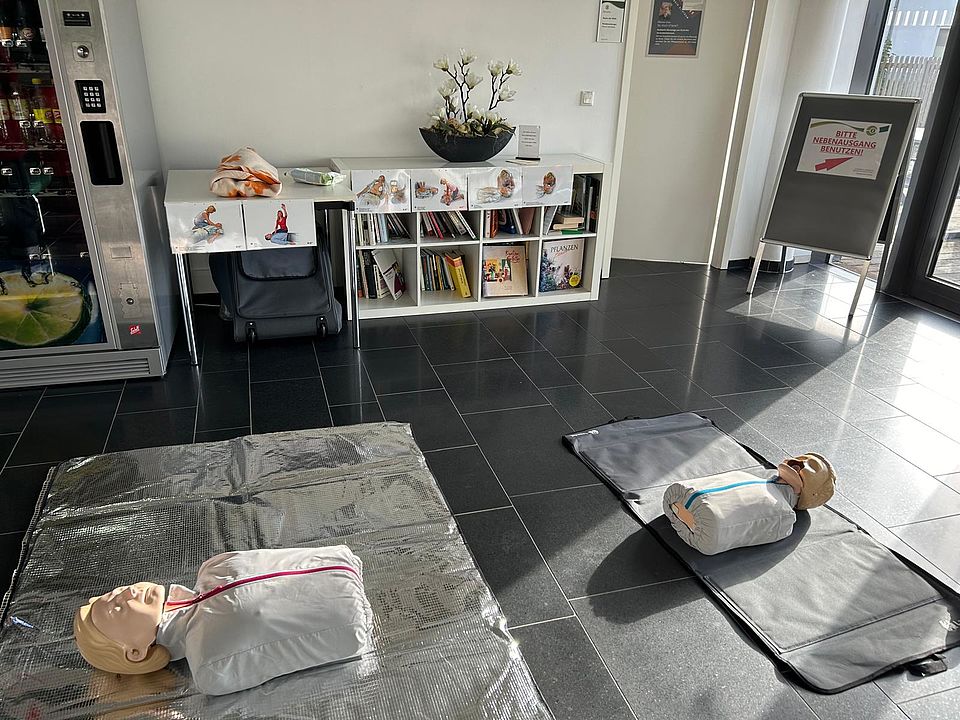 Auch Unser Kreisverband war mit zwei Stationen im Empfangsbereich des Krankenhauses vertreten. Nadine Rosenbusch und Eugen Baumann stellten den Hausnotruf und unsere Rot-Kreuz-Dose für den Kühlschrank vor. Es ergaben sich einige gute Gespräche. Außerdem konnte man bei Christa Kittner die richtige Technik bei der Reanimation üben.
