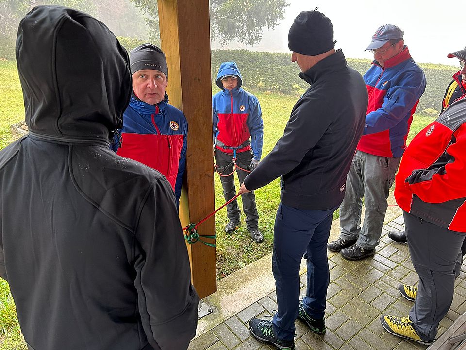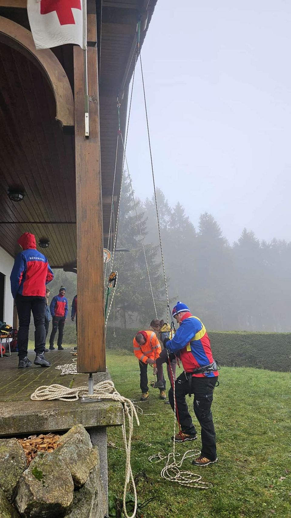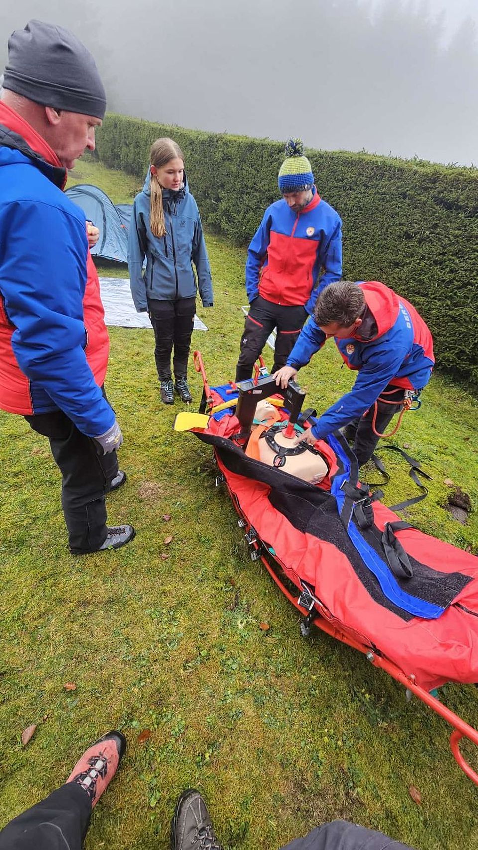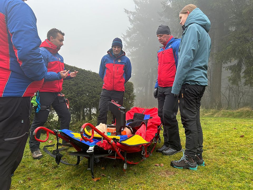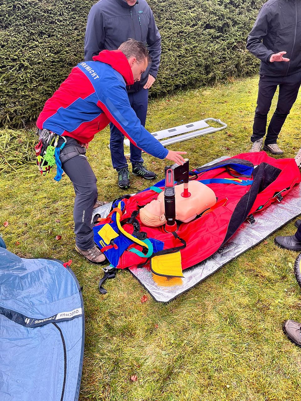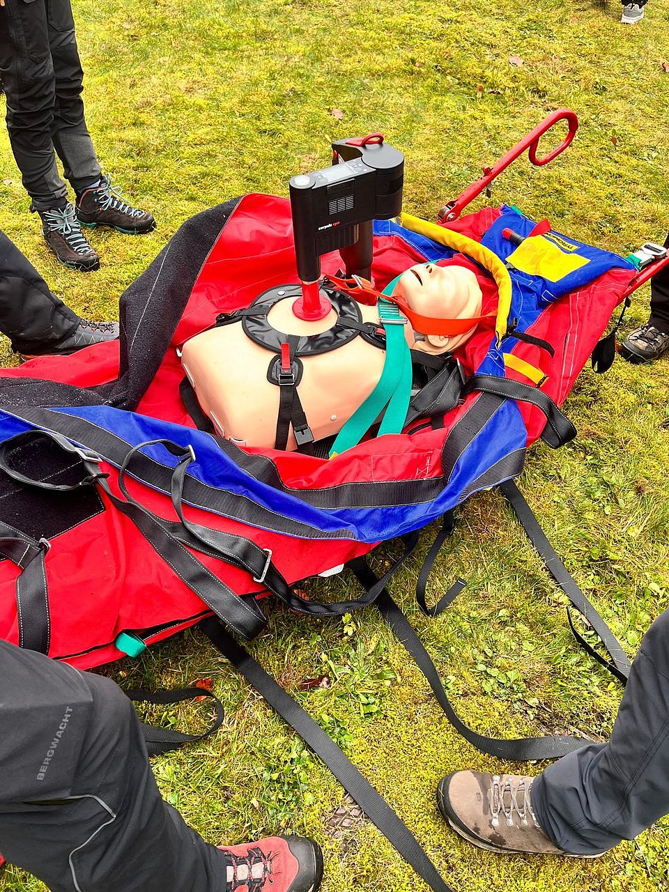 Am Samstag fanden dann noch zwei weitere Ausbildungen statt. Der Kreisleiter der Bergwacht hatte Einsatzkräfte auf die Ebertswiese geladen. Dort trafen sich auch über 30 Kamerad*innen bei passendem Wetter zum Thema. Schwerpunkt des Tages war die Unterkühlung und die fachlich korrekte Versorgung. Außerdem wurde mit einem CPR-Gerät reanimiert und einige Klettertechniken probiert.