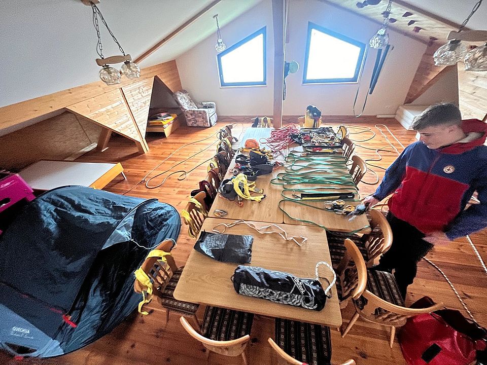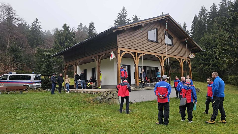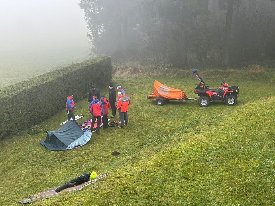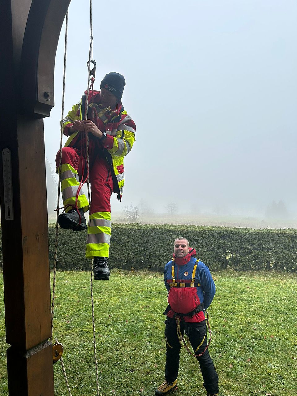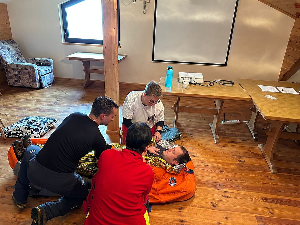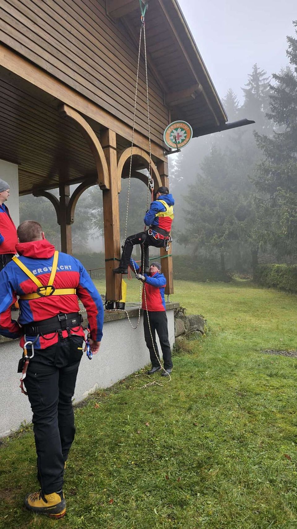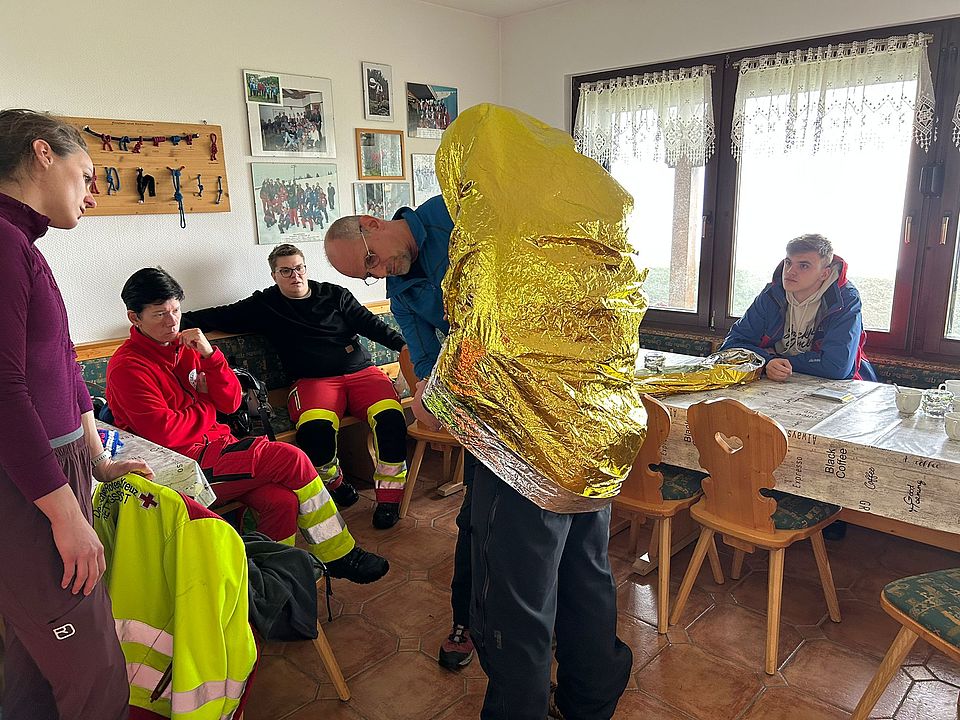 Am Samstag fanden dann noch zwei weitere Ausbildungen statt. Der Kreisleiter der Bergwacht hatte Einsatzkräfte auf die Ebertswiese geladen. Dort trafen sich auch über 30 Kamerad*innen bei passendem Wetter zum Thema. Schwerpunkt des Tages war die Unterkühlung und die fachlich korrekte Versorgung. Außerdem wurde mit einem CPR-Gerät reanimiert und einige Klettertechniken probiert.